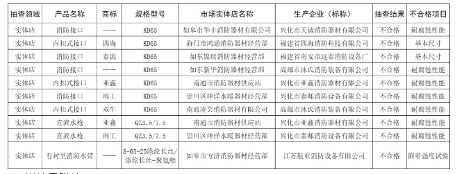 4.消防水槍。共抽查14批次,發(fā)現2批次不合格,問題發(fā)現率為14.3%,不合格項目為耐腐蝕性能。