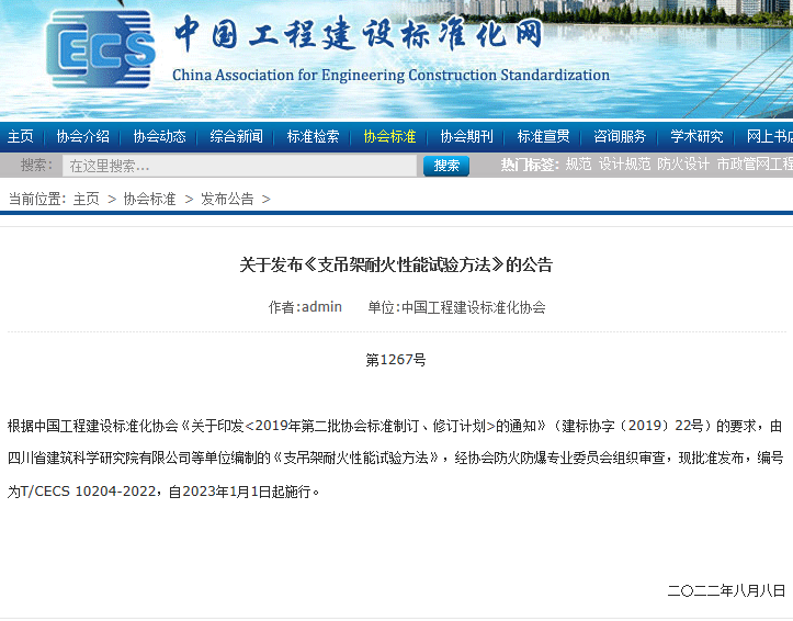 根據(jù)中國(guó)工程建設(shè)標(biāo)準(zhǔn)化協(xié)會(huì)《關(guān)于印發(fā)<2019年第二批協(xié)會(huì)標(biāo)準(zhǔn)制訂、修訂計(jì)劃>的通知》(建標(biāo)協(xié)字〔2019〕22號(hào))的要求,由四川省建筑科學(xué)研究院有限公司等單位編制的《支吊架耐火性能試驗(yàn)方法》,經(jīng)協(xié)會(huì)防火防爆專(zhuān)業(yè)委員會(huì)組織審查,現(xiàn)批準(zhǔn)發(fā)布,編號(hào)為T(mén)/CECS 10204-2022,自2023年1月1日起施行。