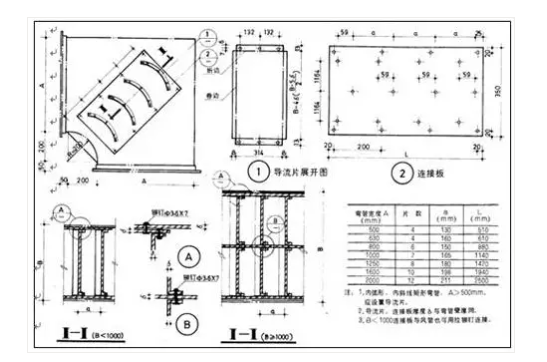 (1)空調(diào)風(fēng)管長(zhǎng)邊尺寸大于500mm直角彎頭應(yīng)加導(dǎo)流片。導(dǎo)流片的弧度應(yīng)與彎管角度相一致。風(fēng)管轉(zhuǎn)彎半徑一般R=D。矩形短半徑彎頭應(yīng)加導(dǎo)流葉片,導(dǎo)流葉片厚度為風(fēng)管的兩倍,不小于60mm,片數(shù)不得少于兩片。