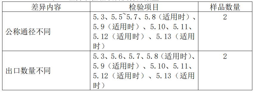認(rèn)證委托人在單元內(nèi)選取公稱(chēng)通徑最大的型號(hào)作為典型產(chǎn)品型號(hào)進(jìn)行 5.2.3、5.3、5.5~5.7、5.8(適用時(shí))、5.9(適用時(shí))、5.10、5.11、5.12 (適用時(shí))、5.13(適用時(shí))、5.14 項(xiàng)目的檢驗(yàn),其他型號(hào)按照表 1 規(guī)定 進(jìn)行差異項(xiàng)檢驗(yàn)。