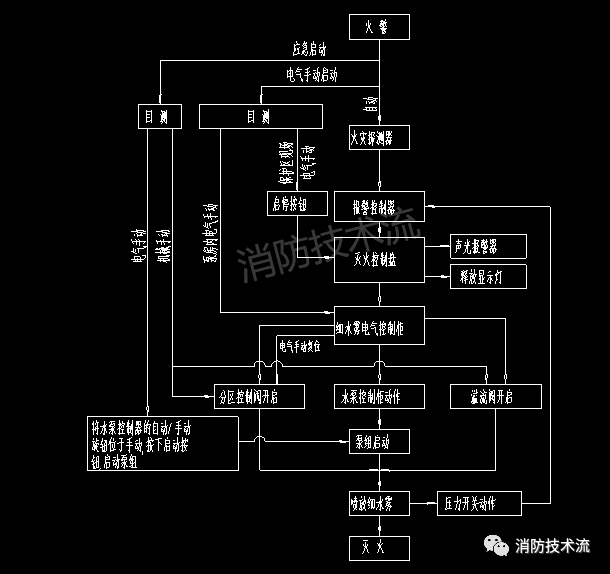 ?。?)自動控制:防護(hù)區(qū)內(nèi)一路探測器報警后,滅火控制器發(fā)出聲光警報信號,當(dāng)兩路探測器報警確認(rèn)火災(zāi)后,滅火控制器驅(qū)動防護(hù)區(qū)內(nèi)外的聲光警報器,經(jīng)30s延時發(fā)出滅火指令至細(xì)水霧裝置控制柜打開對應(yīng)區(qū)域的分區(qū)控制閥,并發(fā)出啟泵信號至水泵控制柜,啟動系統(tǒng)實施滅火。壓力開關(guān)動作后,反饋動作信號滅火控制器聯(lián)動點亮防護(hù)區(qū)入口處的噴放指示燈。開式系統(tǒng)的響應(yīng)時間不應(yīng)大于45s。